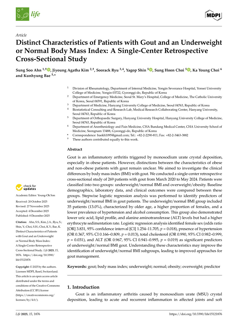 연구팀은 2020년 3월부터 2024년 5월까지 통풍으로 외래 또는 입원 진료를 받은 환자 269명을 대상으로 체질량 지수(BMI)에 따라 정상/저체중군(BMI 23 kg/㎡ 미만)과 과체중/비만군(BMI 23 kg/㎡ 이상)으로 나누어 임상적 특성과 혈액 검사 소견을 비교하였습니다. 분석 결과, 정상/저체중 체질량 지수를 가진 통풍 환자는 전체 환자 중 35명(13.0%)으로 확인되었습니다. 이 환자군은 ① 연령이 더 높고, 여성 비율이 높으며, ② 고혈압과 음주 비율이 낮고, ③ 혈액검사에서는 요산, 지질(콜레스테롤/중성지방), 간수치인 ALT는 낮고, 염증 수치인 ESR은 더 높은 경향을 보였습니다. 또한 정상/저체중 통풍 환자와 연관된 독립적인 요인으로는 여성, 고혈압, 총콜레스테롤, ALT 가 확인되었습니다. 본 연구는 통풍은 비만인 환자에서만 생기는 질병으로 단정하기보다 정상 체중(특히 여성/고령)에서도 통풍이 충분히 발생할 수 있고, 전형적인 대사증후군 소견을 보이지 않는 경우라고 하더라도 통풍을 감별해야 할 필요성이 있다는 점을 시사합니다. 연구진은 BMI나 전형적 대사 위험인자가 없다는 이유만으로 통풍 가능성을 배제하지 말고, 정상 체중 환자에서는 신장 기능, 동반 약물, 음주 등 ‘비(非)비만 관련 요인’ 까지 더 폭넓게 고려할 필요가 있다고 강조했습니다. 본 연구 결과는 생명과학의 기본 원리, 임상·응용 연구를 다루는 학술지인 Life (IF 3.4, JIF percentile 79.9)에 최근 게재되었습니다 (Life (Basel). 2025 Dec 8;15(12):1876).